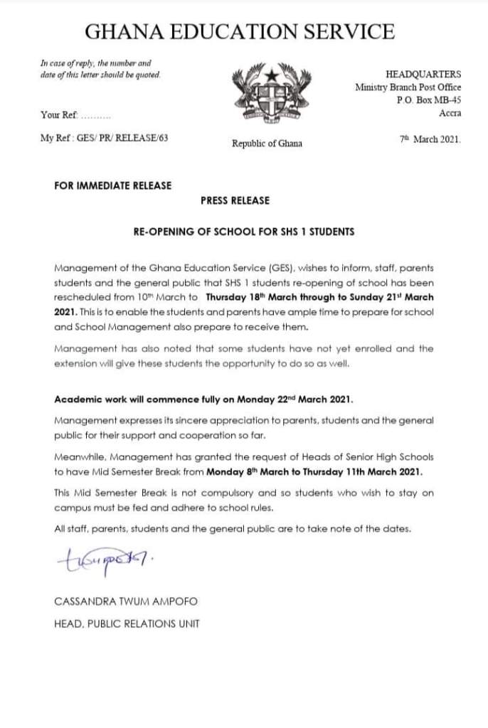Management of Ghana Education Service (GES), wishes to Inform, staff, parents students end the general public that SHS 1 students re-opening of school has been rescheduled from 10w March to Thursday 18′ March through to Sunday 21 ‘ March 2021. This is to enable the students and parents have ample time to prepare for school and School Management also prepare to receive them.