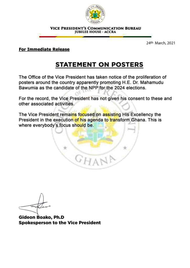 The Office of the Vice President has taken notice of the proliferation of posters around the country apparently promoting H.E. Dr. Mahamudu Bawumia as the candidate of the NPP for the 2024 elections.