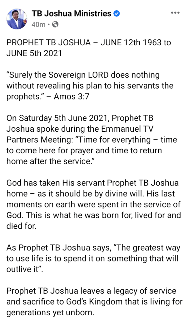 God has taken His servant Prophet TB Joshua home – as it should be by divine will. His last moments on earth were spent in the service of God. This is what he was born for, lived for and died for.