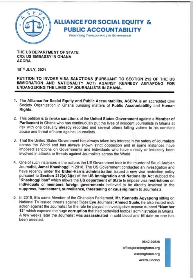 ASEPA has today filed a petition with the US Department of State through the US Embassy in Ghana, to invoke Visa Restrictions against Kennedy Agyapong pursuant to Section 212 of the US Immigration and Nationality Act.