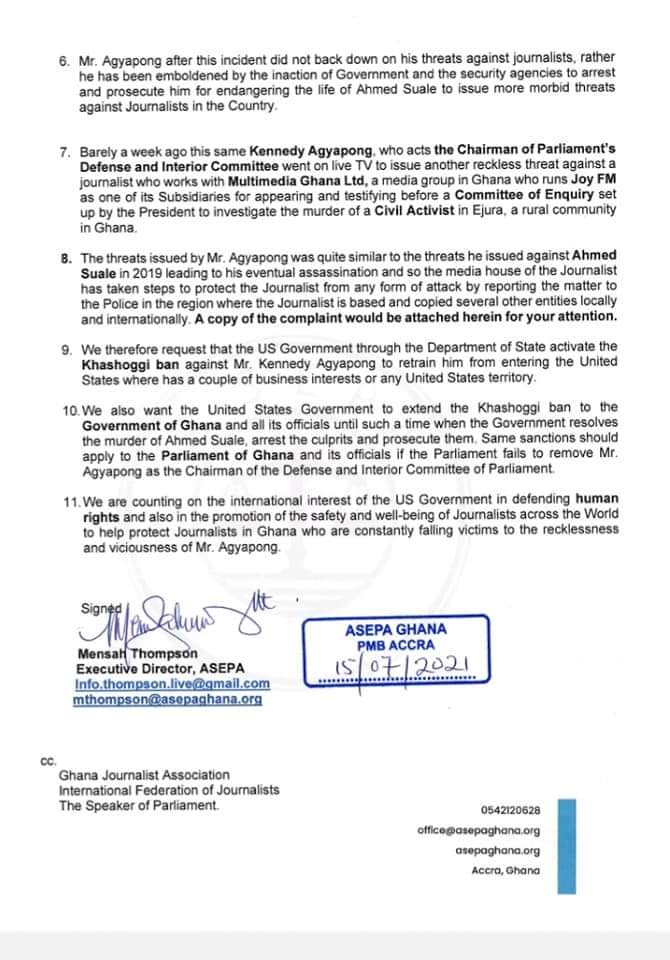 ASEPA is also asking for the ban popularly known as the Khashoggi ban instituted by the US Government after the murder of Saudi Journalist Jamal Khashoggi to be extended to Parliament of Ghana and it’s officials if they fail to remove Kennedy Agyapong as Chairman of the Defence and Interior Committee of Parliament.