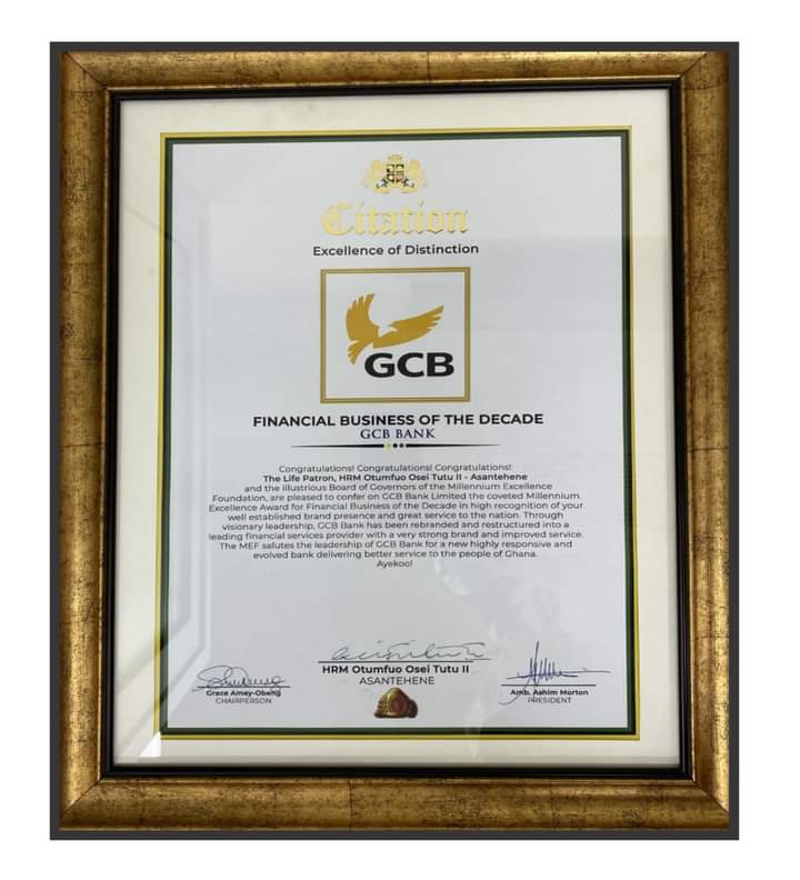 GCB Bank Ltd. has been voted the Financial Business of the Decade at the Millennium Excellence Awards programme held at the courtyard of the Manhyia Palace in Kumasi at the weekend.
