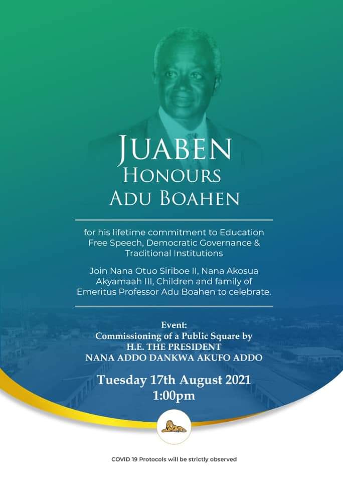 Isn’t it remarkably educational that a town like Dwaben, whose name immediately takes one’s mind back to a vexatious history, should be one of the few towns in Ghana to recognise the value of true scholarship to such an extent as to name a public square – not after someone with bags of money, but someone with a mind immensely enriched by history – and who was not chary of relating unpalatable historical truths in his books?