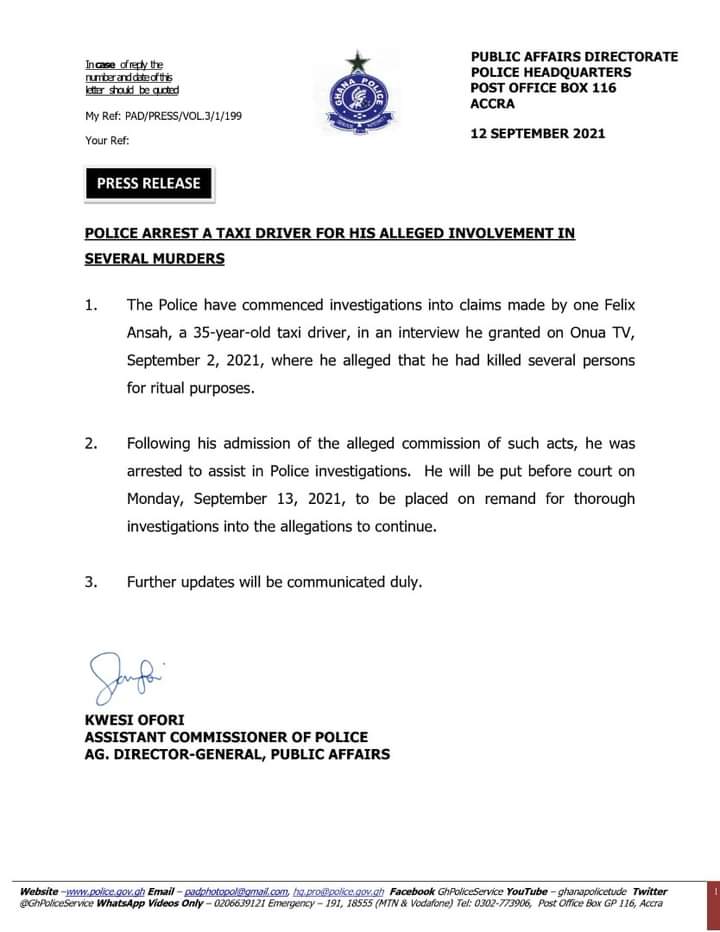 The Police have commenced investigations into claims made by one Felix Ansah, a 35-year-old taxi driver, in an interview he granted on Onua TV, September 2, 2021, where he alleged that he had killed several persons for ritual purposes.