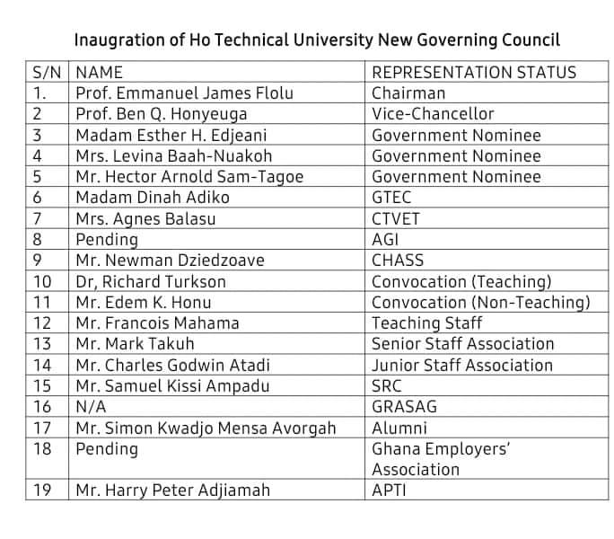 A 19-member Council for Ho Technical University has been inaugurated on 1st October 2021, at the Ministry of Education in Accra to replace the old Council whose tenure expired in May 2021.