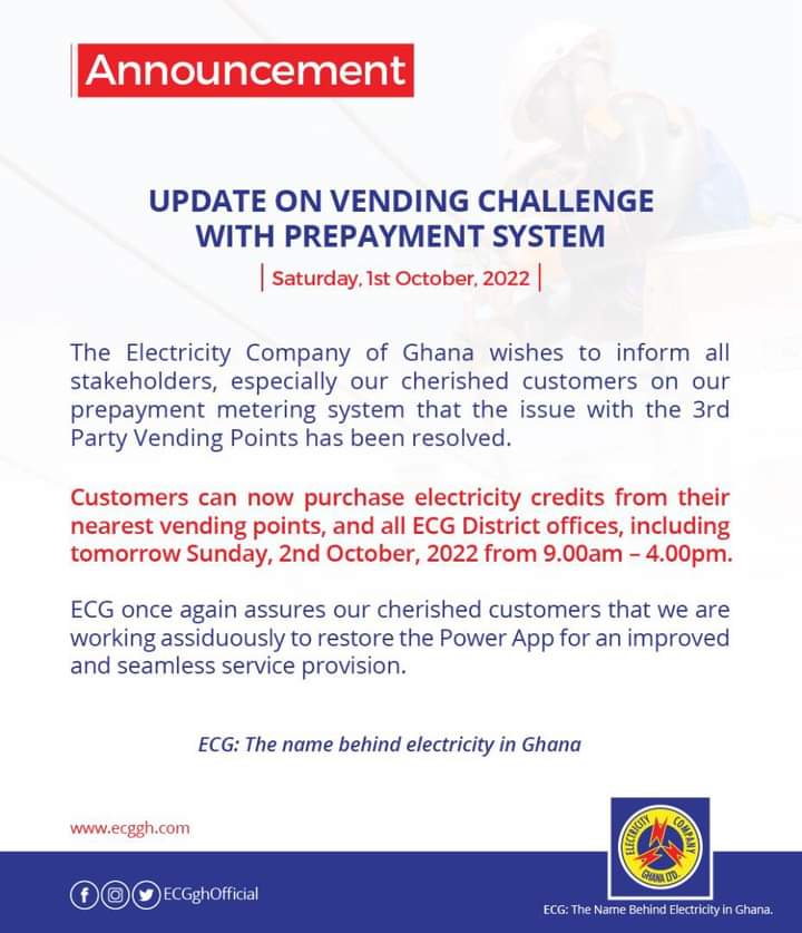 They said Customers can now purchase electricity credits from their nearest vending points, and all ECG District offices, including Sunday, 2nd October 2022 from 9.00 am-4.00 pm.