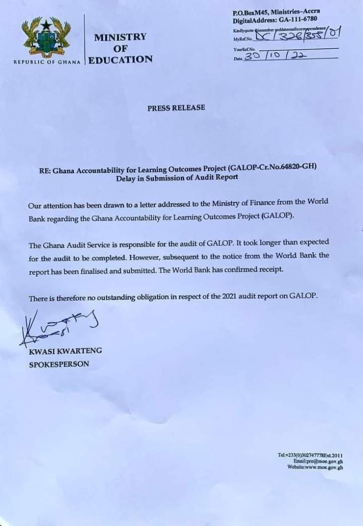 Our attention has been drawn to a letter addressed to the Ministry of Finance from the World Bank regarding the Ghana Accountability for Learning Outcomes Project (GALOP).